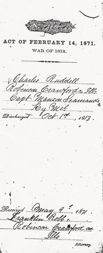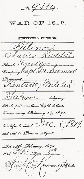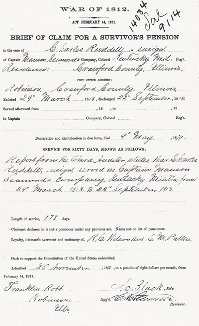 In the case of Charles Ruddell, ensign, of Captain Manson Seamond's Company, Colonel Kentucky Mil. Reg't. Residence: Crawford County, Illinois. Address Robinson, Crawford County, Illinois, Enlisted 29, March 1813, discharged 22, September, 1813. Declaration and identification in due form, filed 9, May, 1871.