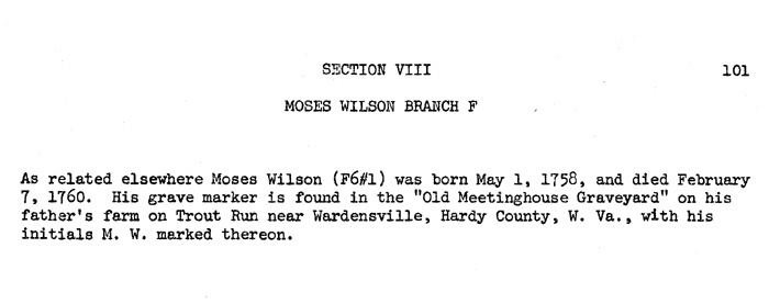 William Wilson (11/16/1722 Ulster, Ireland d 6/12/1801 Trout Run, Hardy Co. VA, now WV family cemetary near family farm in Wardensvill, Hardy Co. pictured Above.) m Elizabeth Blackburn (1725-1806) |