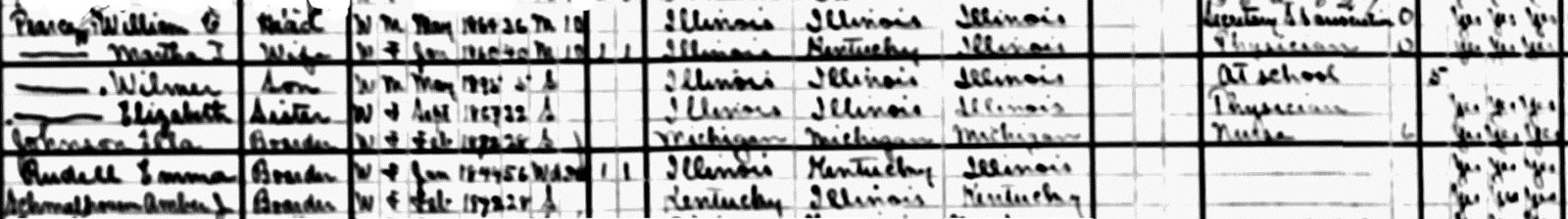 | Pearce, Elizabeth: Sister, Boarder, White, Female. Born Sept. 1867, 32 years. Born Illinois. Physician |