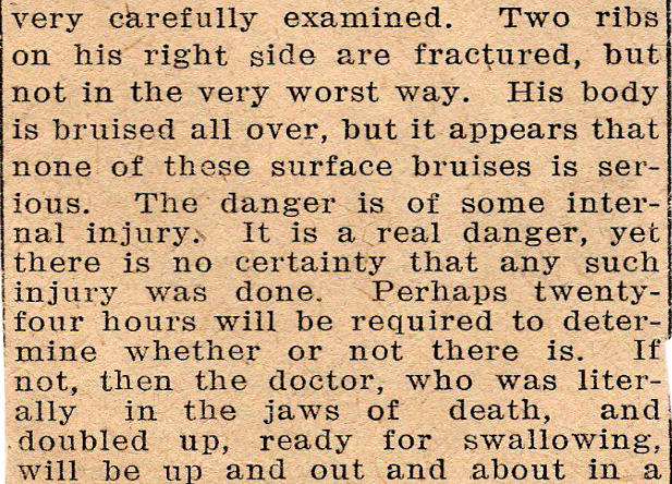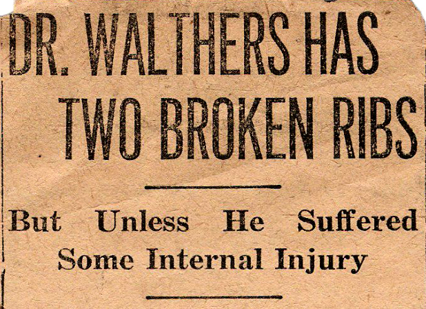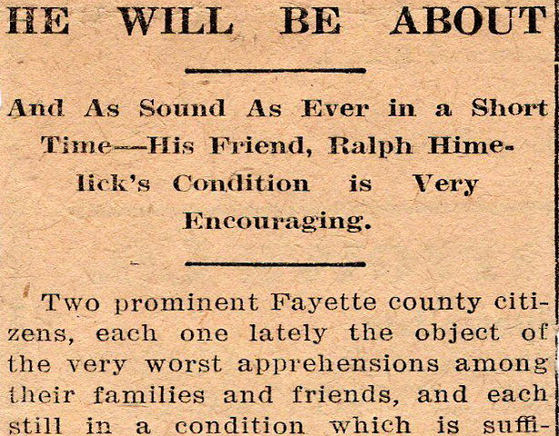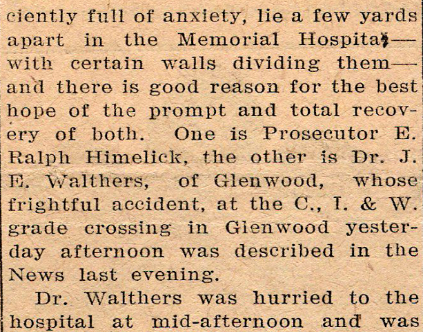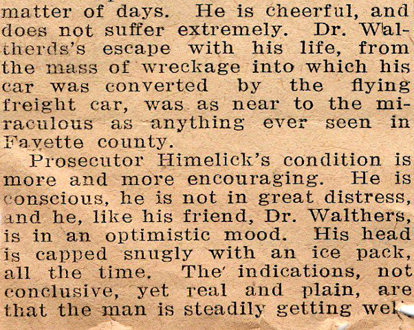 matter of days. He is cheerful, and does not suffer extremely. Dr. Walthers' escape with his life, from the mass of wreckage into which his car was converted by the flying freight car, was as near to the miraculous as anything ever seen in Fayette county.